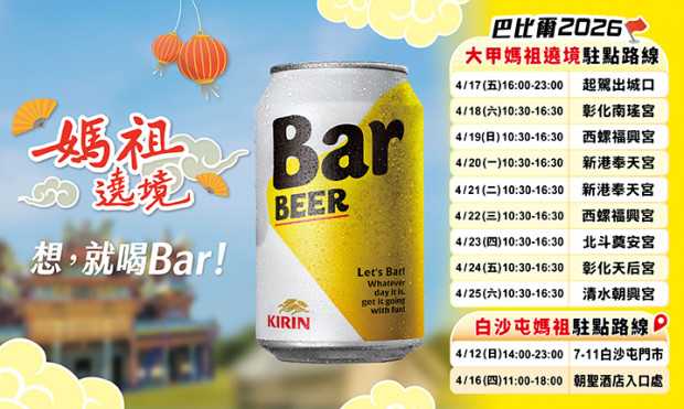 KIRIN Bar BEER多年來秉持著活力、積極的精神,每年持續參與台灣年度盛事「大甲媽祖九天八夜遶境」及「白沙屯媽祖進香」活動,號召粉絲們一起到各大駐駕點和巴比爾一起應援媽祖遶境Bar!