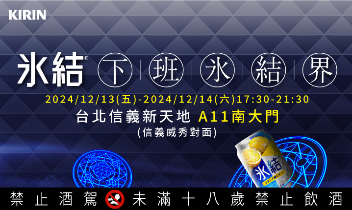 最受歡迎的罐裝調酒「KIRIN冰結調酒」即將在信義區舉辦「下班冰結界」活動,超炫光影設計、在空中與地面交織的雷射光束,再加上DJ現場演出,12/13(五)-12/14(六) 17:30~21:30和大家一起嗨翻信義區周末夜,現場還可以免費兌換冰結!