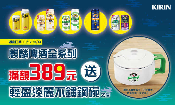 購買麒麟啤酒系列商品,滿額389元即有機會獲得【輕盈淡麗不鏽鋼碗】乙個。