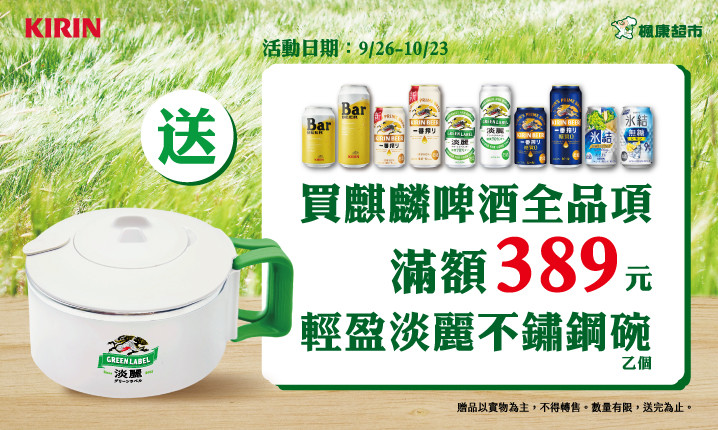 購買麒麟啤酒系列商品,滿額389元即有機會獲得【輕盈淡麗不鏽鋼碗】乙個。