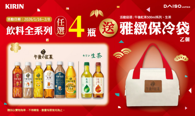 購買KIRIN飲料系列(原味紅茶/檸檬紅茶/無糖紅茶/奶茶/皇家特調奶茶500ml/生茶/焙茶525ml) 任4瓶送【雅緻保冷袋】乙個