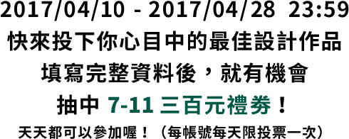 5. 所有投稿稿件之著作人格權為設計者所有。但一經投稿,投稿參賽者同意主辦單位使用投稿稿件作為活動宣傳、推廣、設計…等用途。