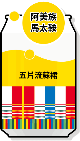 #阿美族黃敬家 (Panay Dipus)設計師聯名 透過黑色線條勾勒出,阿美族文化中男子服飾的片裙,在歌謠與舞蹈中飛起的情境,陽剛的黑色和柔和的流線也象徵堅定的自我認同以及文化傳承。並以不規則的色塊黃、紅、綠、藍,分別代表著阿美族的活力、故鄉以及山海之情。 菱形符號就如牽起的手,環繞擁抱,成為阿美族熱情奔放的精神。