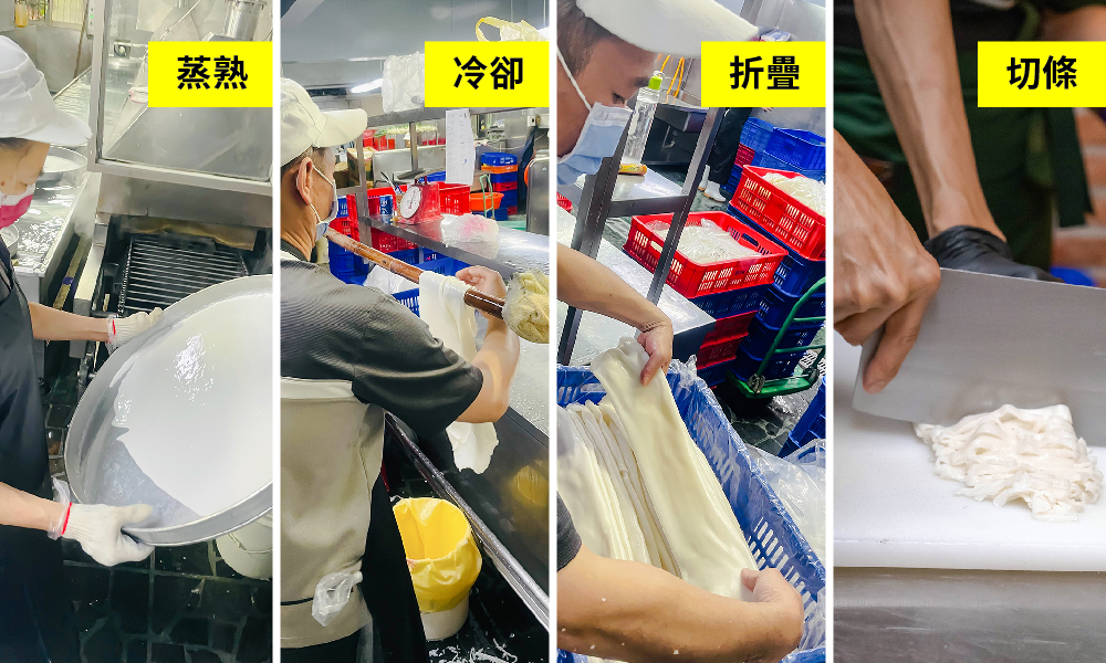 在中央廚房將白米浸泡,磨成濃稠米漿,均勻地攤在鐵盤上放入蒸籠高溫蒸煮,米漿搖身一變,成了Q彈米干!將大大的米干薄片晾在竹竿上風乾冷卻,再切成條狀,米干完成!