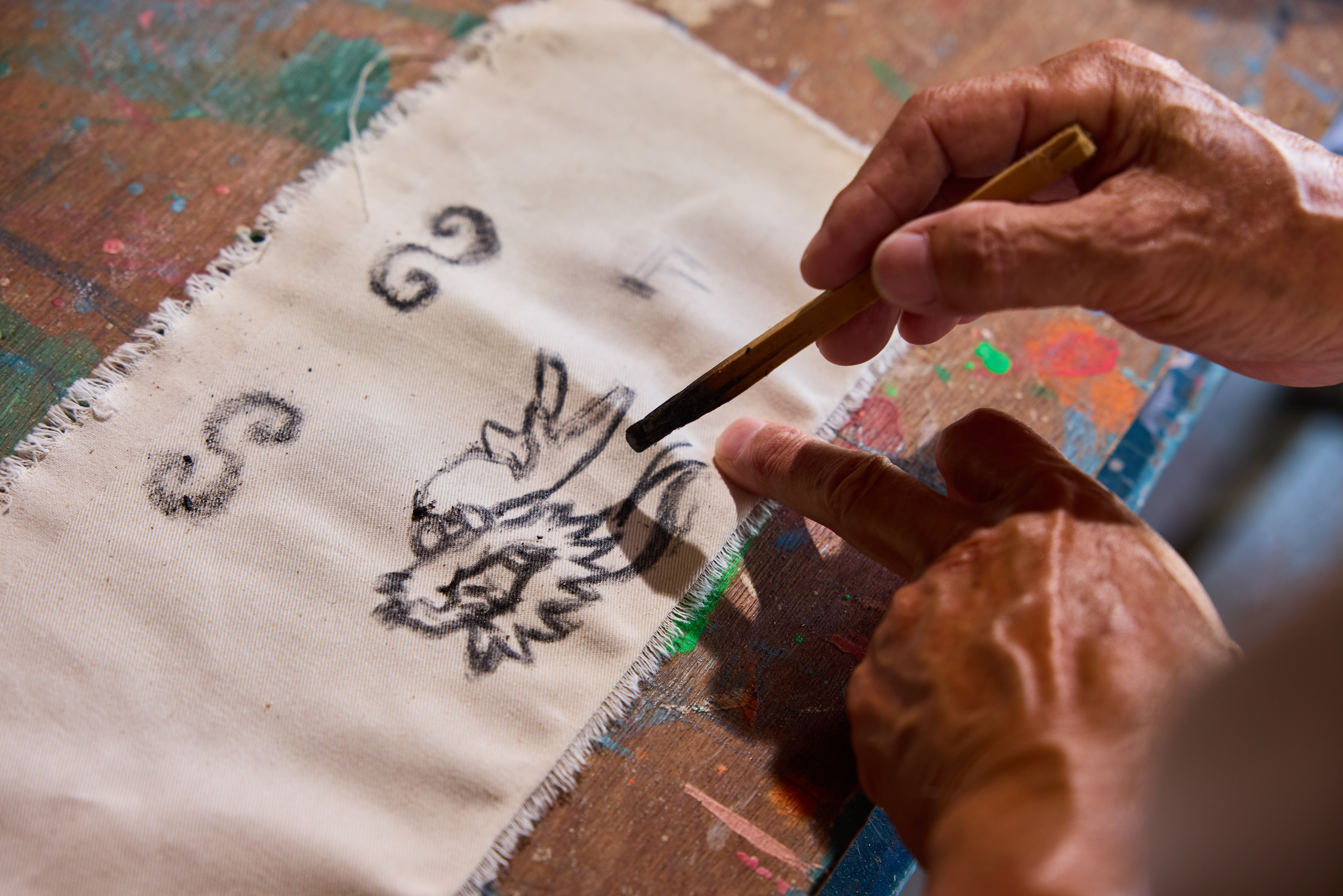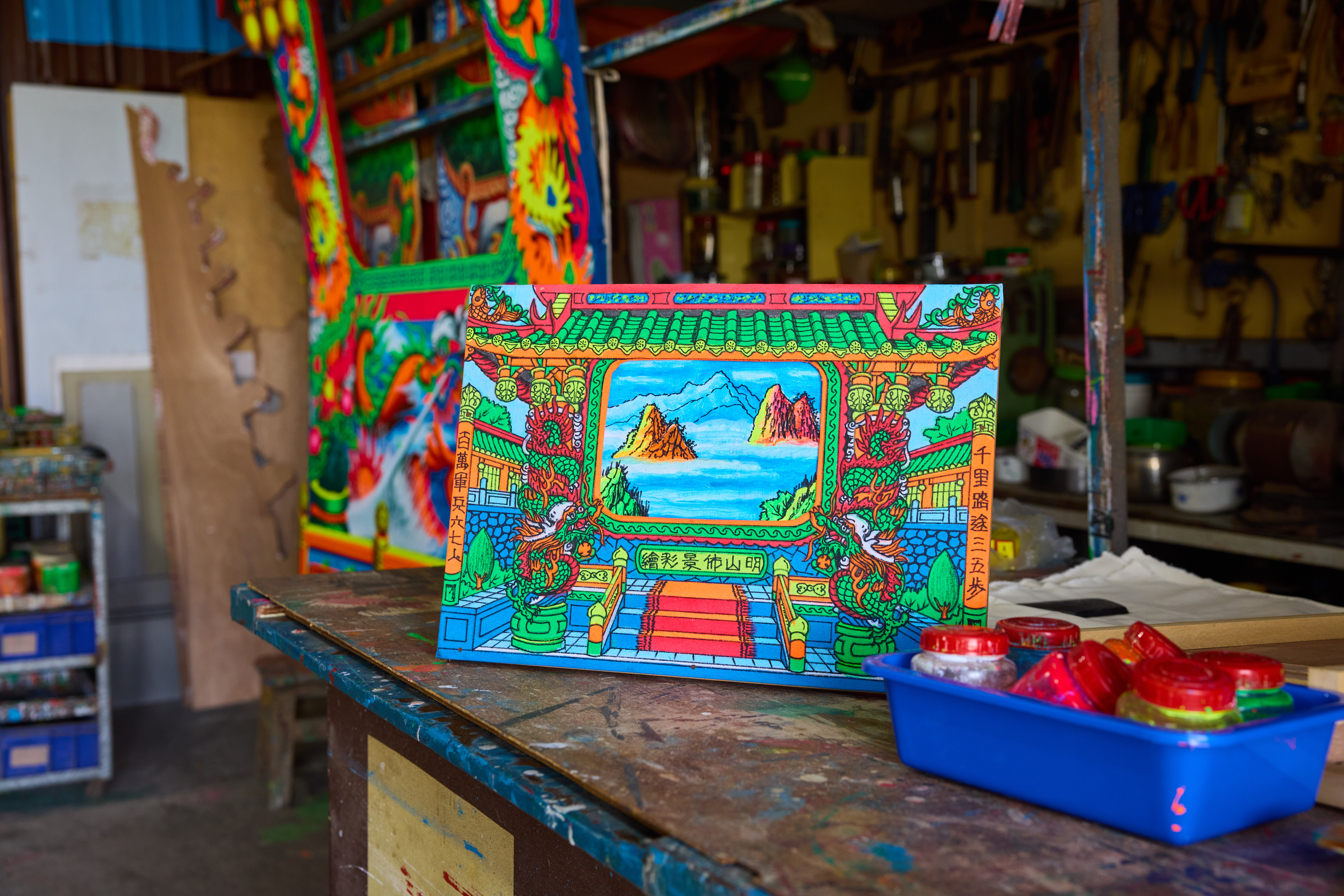 佈景彩繪除了講究畫工,更考驗彩繪師的內涵。委託方只會提供故事文本、劇情內容,以及佈景尺寸,其他都由彩繪師自行想像建構。陳明山笑說小時候熱愛看漫畫、武俠小說,常常沉迷的看到天亮。而這些累積都成為他往後繪景時腦中的素材,有如皇帝的出場要有華麗的金鑾殿襯托、包青天就直接聯想到公堂,舞台佈景讓觀眾一眼入戲,加深舞台上表演的生動性。它們不只是背景,更是打開想像的媒介,讓人一踏入場域,便知一場戲、一場儀式即將開始。