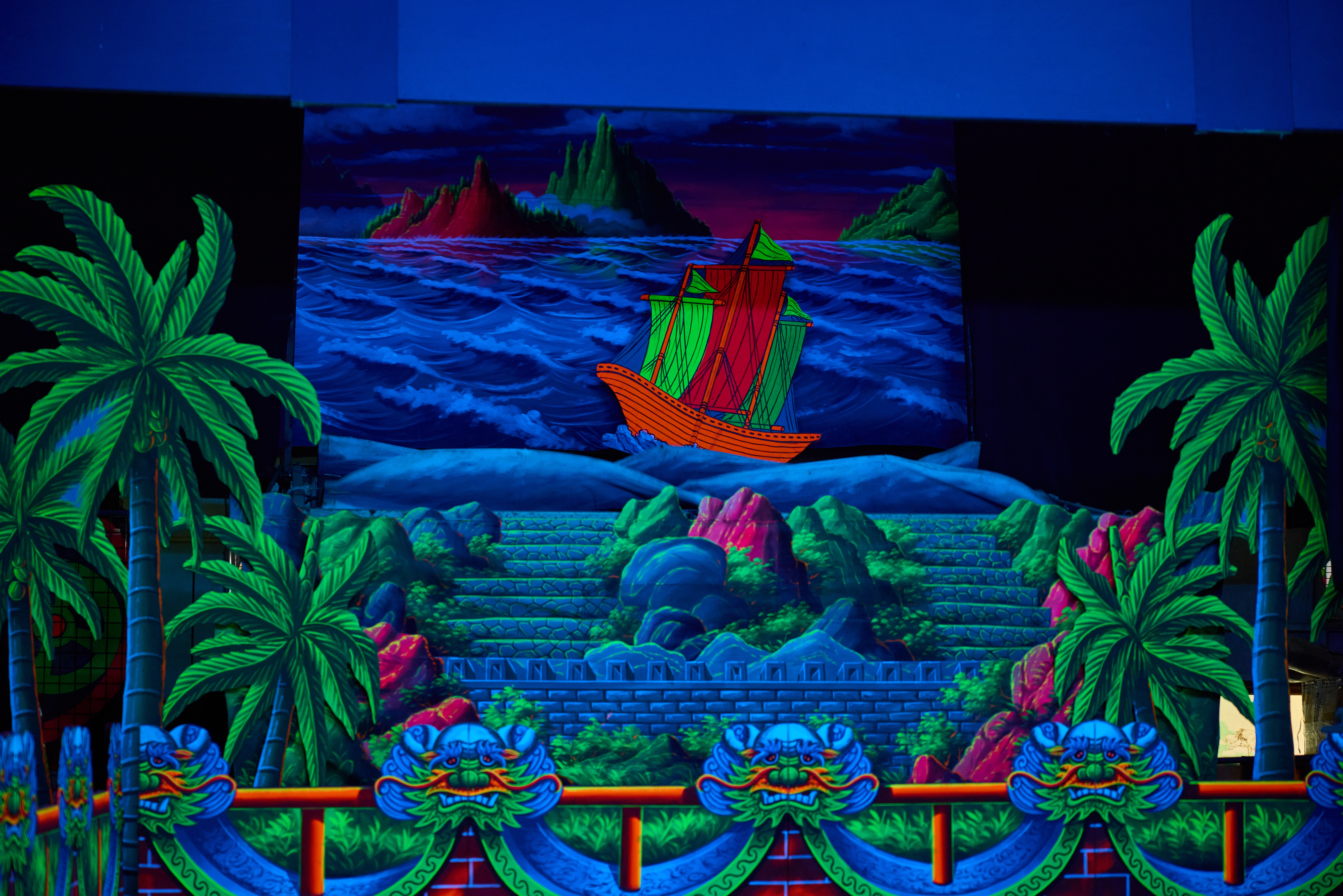 除了戲劇佈景,陳明山也跨足醮壇、花燈、藝閣、肉山等佈景製作,傳承自張錦濤開創的螢光顏料,更在陳明山這一代弟子手中大量活用,讓佈景在夜晚的燈光下更加豐富多變,開創彩繪佈景的先河。