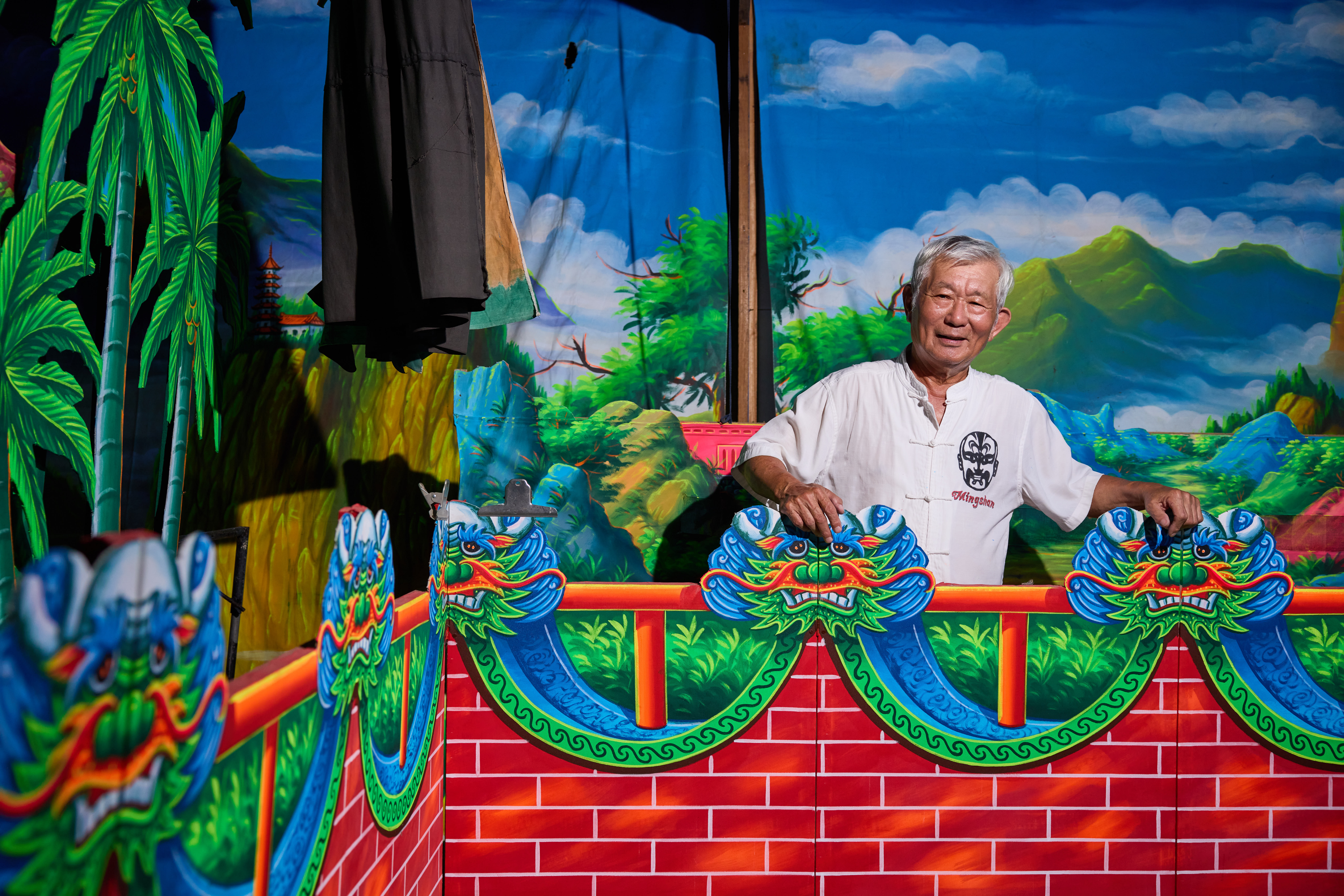 入行至今一甲子,陳明山過去與中南部一代的戲班密切合作,他總是自己製作骨架、調製顏料,從早期的塑膠漆、水性水泥漆,到後期的螢光漆,畫面越發鮮艷搶眼,景片的設計搭配透視技法也讓場景的層次更加豐富,每當畫布升起,舞台就活了起來。一甲子的創作累積了無數作品,如今還留有他彩繪佈景作品的劇團,個個都視之為文化資產,不輕易拿出來使用。