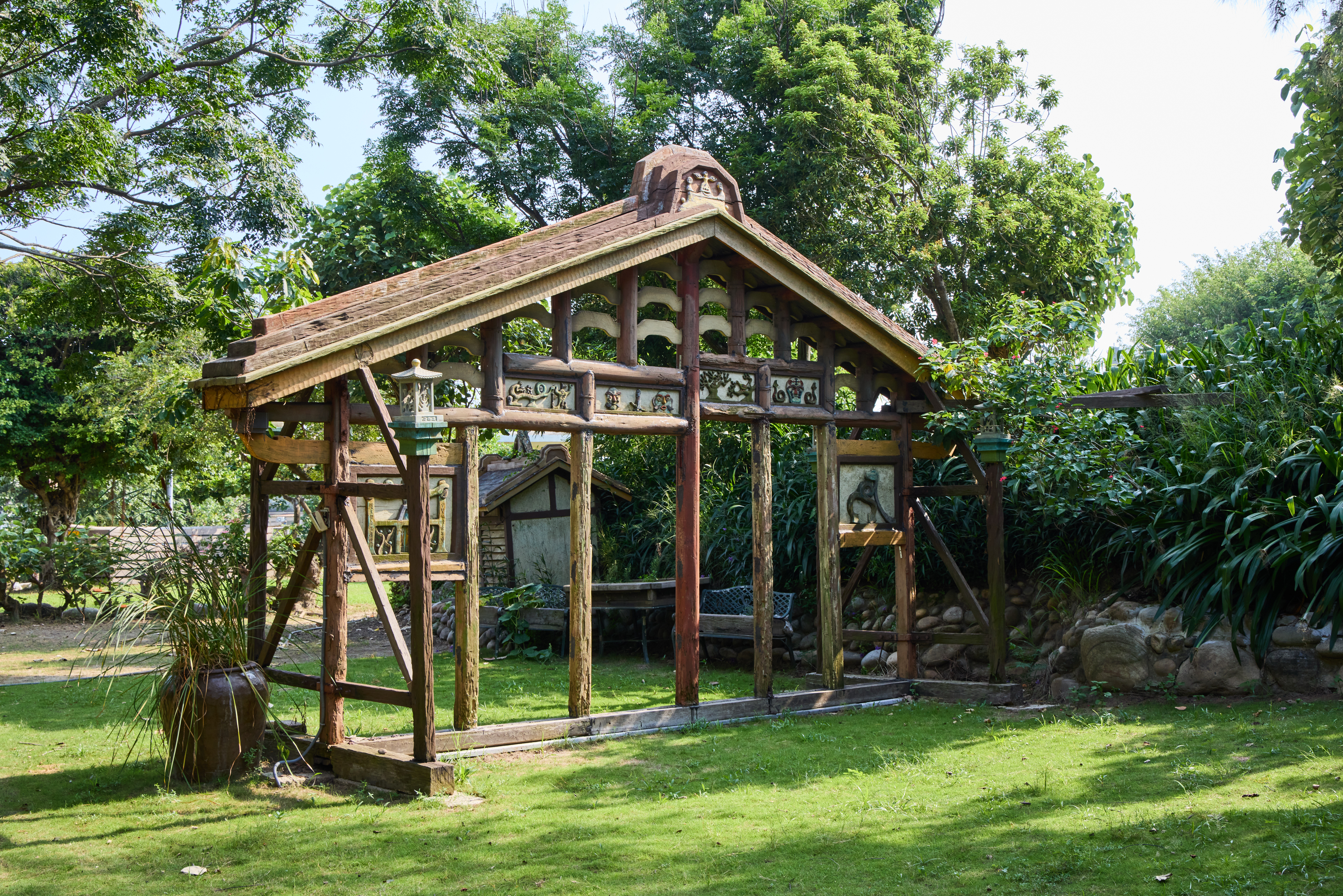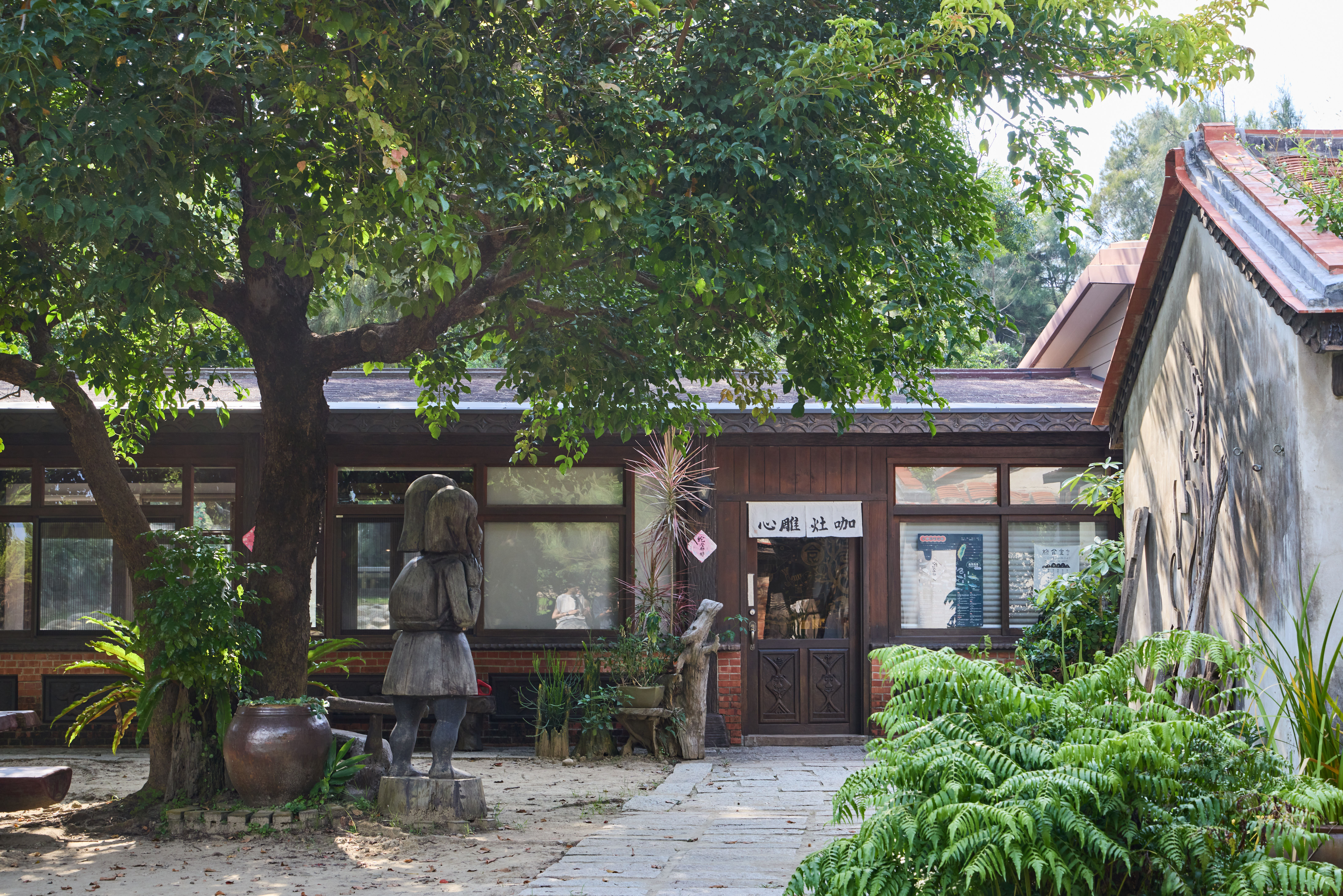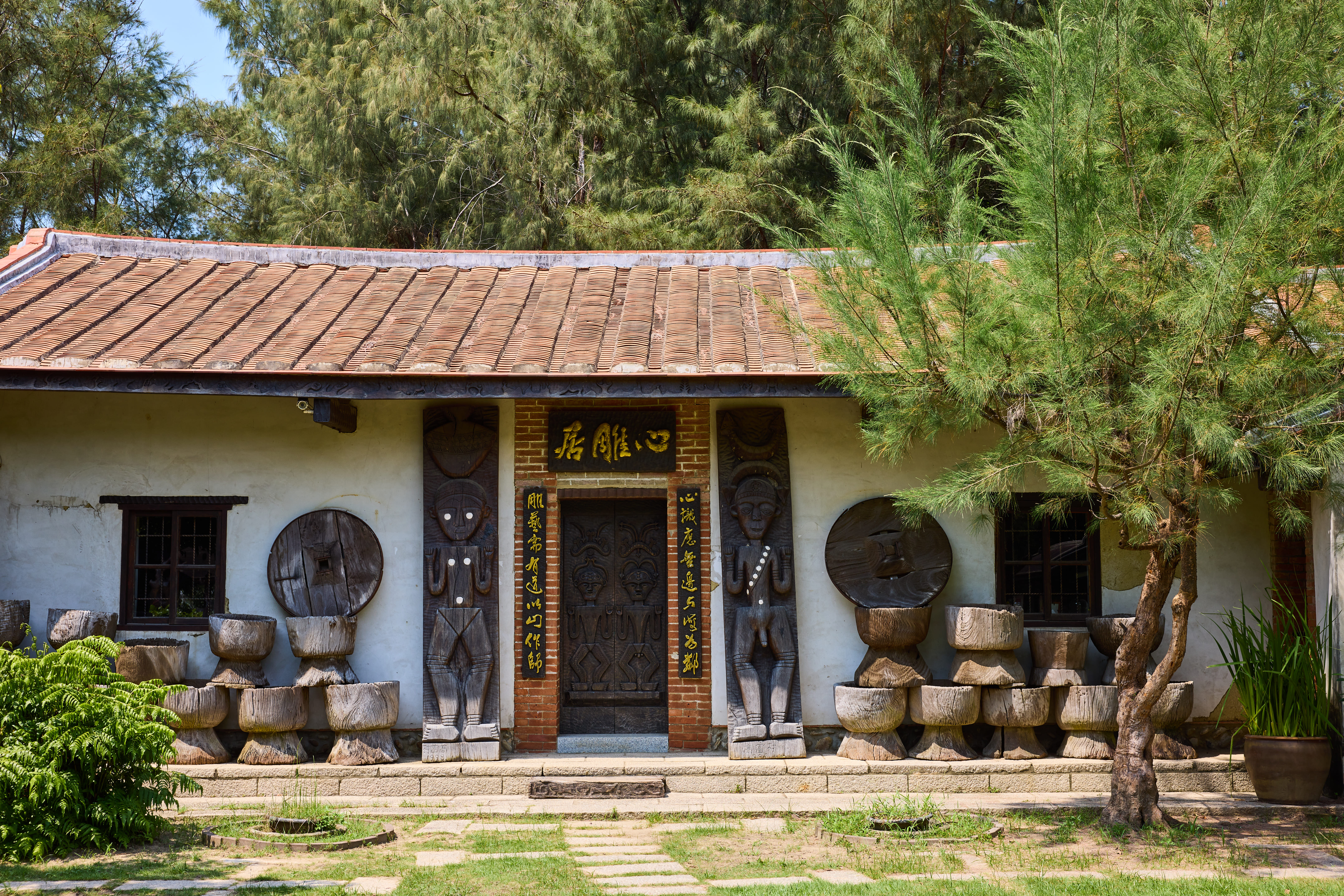 不同於知名的三義木雕風格,在靠近海邊的苗栗苑裡鎮,有一間融合閩式古厝與排灣木雕的「心雕居」古厝靜靜矗立,除了復刻排灣的傳統雕塑、排灣涼亭,以及以鵝卵石取代石板堆成的百步蛇圍牆,園內更多的是原民風格延伸的木雕,以及出生成長於此、並在此發展創作的陳氏父子三人的原創木雕創作,都展示在古厝裡。