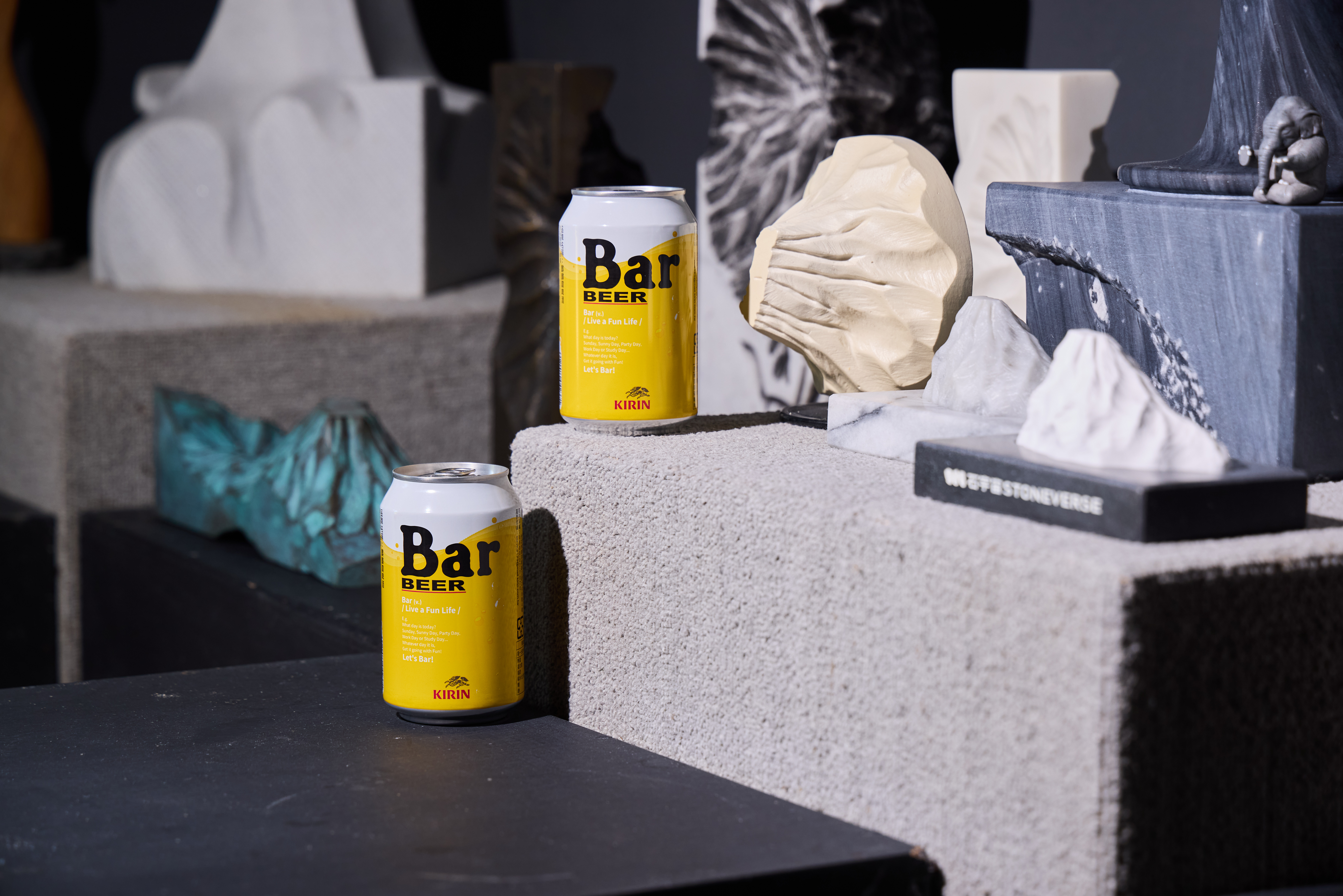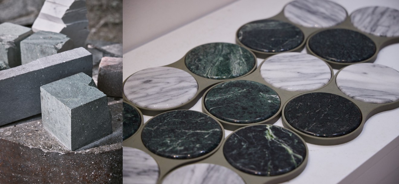 本次與Bar BEER合作的馬賽克杯墊,取材自四種石材,分別為花蓮地震後受損的大理石板材「雪白銀狐」、黑白根、灰雕,與展現Bar罐黃色部位的環保石材淤泥。這樣的組合同時展現了石材的多元與混用彈性,也體現了當代石材工藝的創意展現,帶出如今花蓮石雕工藝的多元風貌。