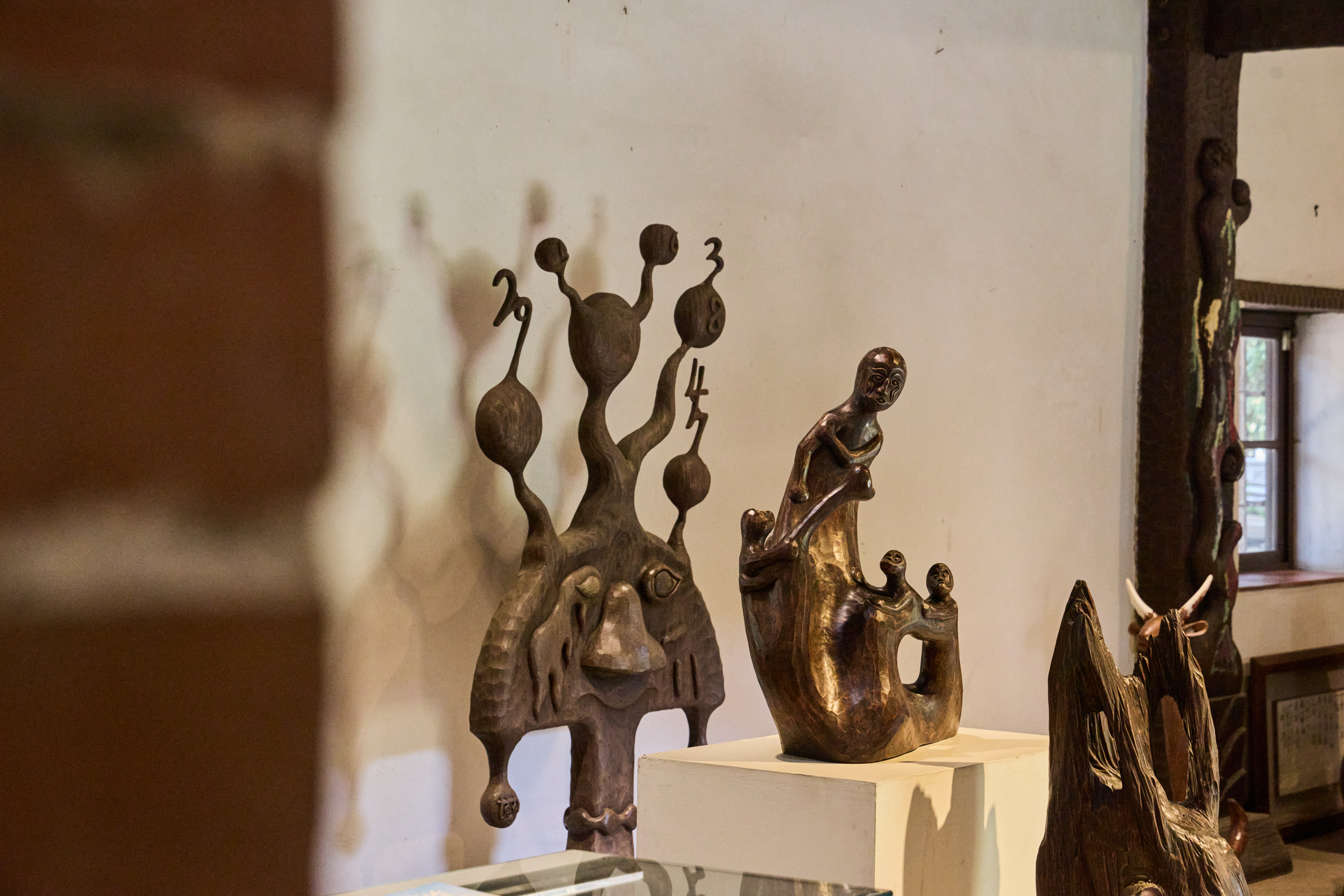 這些年來,陳清海邊創作邊修復古厝,順著土地與樹木的紋理,應著自然的脈絡修復空間樑柱、門板,並將中庭的主屋改建為博物館,蒐藏三人的重要創作。父親陳成合多以海邊的漂流木混用複合媒材,創造充滿童趣與幻想的作品;而始終留在苑裡的陳清海,承繼兄長的職人精神,木雕創作多取材記憶中農業時代的人情往來,以各色鮮活的木雕臉孔,融入日常的手作家具、建築樑柱與大尺寸的木雕創作,成為心雕居充滿生命力的風景。