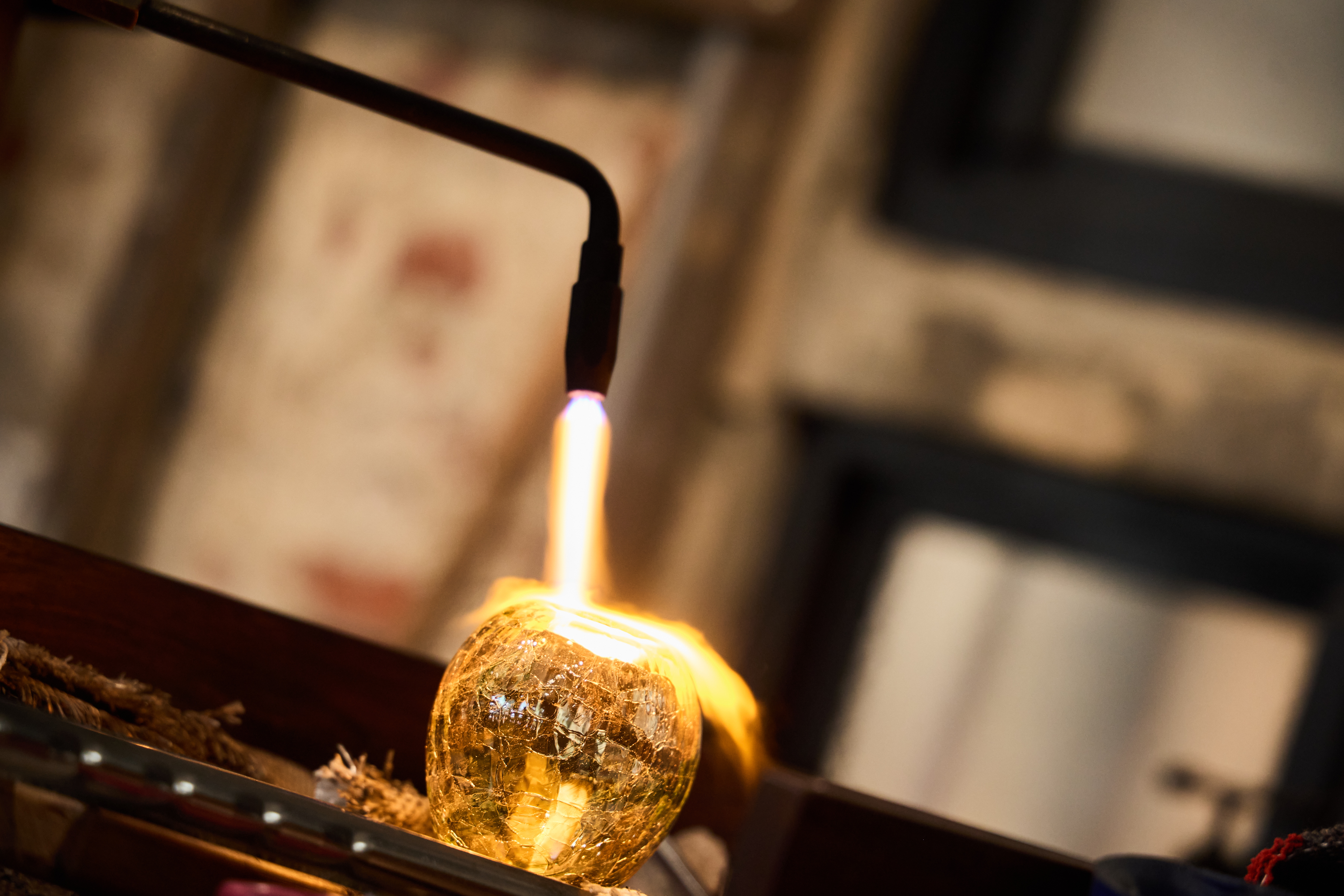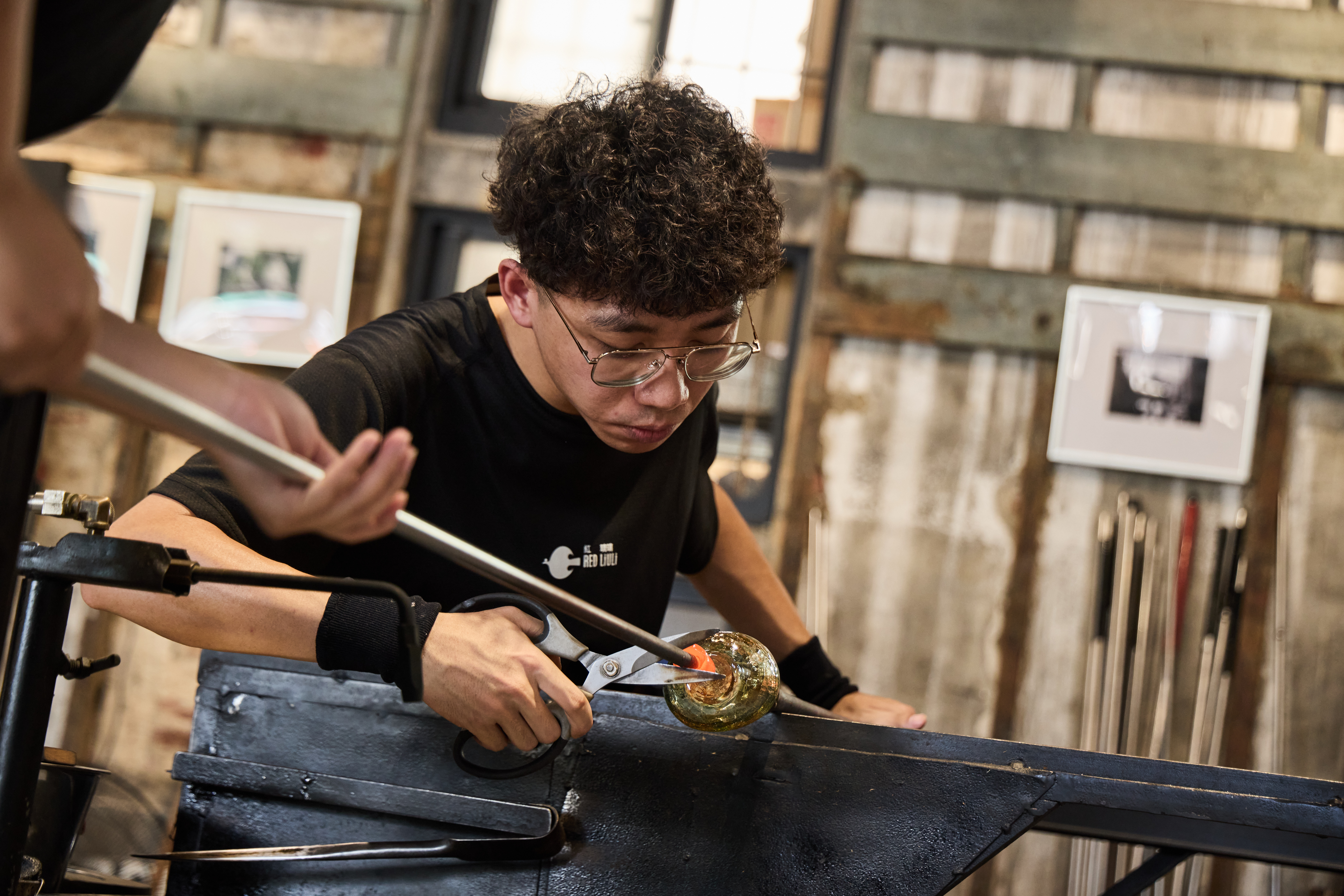 晶瑩的光澤,流動的紋理,師傅屏息凝神,輕輕吹氣,晶瑩的球體便在火光與呼吸之間成形,透過師傅的巧手塑型,天空中的雲彩便凝固在杯體。「探索工藝 Bar」邀請你走入玻璃的世界,在鶯歌「紅琉璃」親眼看見職人如何用雙手創造,讓這門古老的工藝在現代持續閃爍,在每一件琉璃作品與生活器物中發光。與此同時,也透過合作的「玻璃工藝Bar 琉光杯」,感受紅琉璃是如何以傳承與創新精神,讓玻璃工藝在生活器皿藝品之間,持續呼吸與應用。
