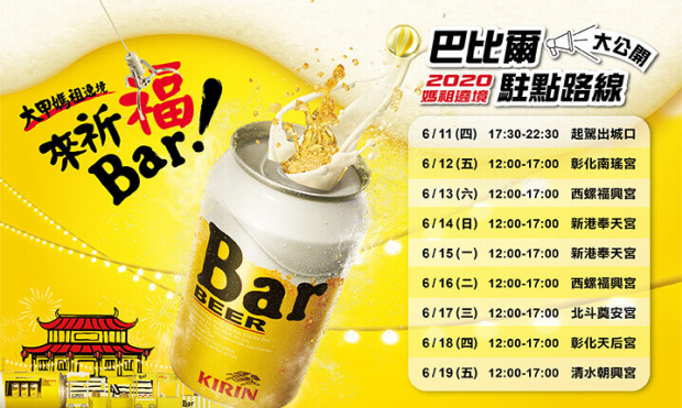 KIRIN Bar BEER多年來秉持著活力、積極的精神,參與年度盛事「大甲媽祖九天八夜遶境」活動。今年,KIRIN Bar BEER也將延續行動力十足的媽祖遶境精神,到場設點應援,號召粉絲們一起到大甲媽祖駐駕點來祈福Bar!