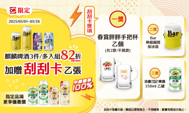 2.兌獎方式:刮中「春賞胖胖手把杯」 、 「Bar伸縮圓筒保冰袋」、 「淡麗GREEN LABEL啤酒350ml 一罐」、 「Bar 330ml一罐」 、 「一番搾零糖質2罐折20元抵用卷」請於活動期間2025/5/1-5/28向原購買OK門市服務人員兌換,逾期視同放棄中獎資格。