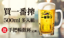 指定通路買一番搾啤酒500ml多入組,送「手把暢飲杯」啤酒杯乙個!