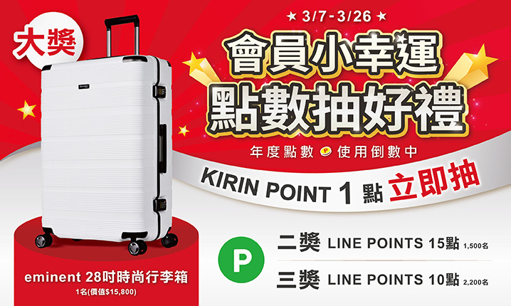 ▲【點數抽】:KIRIN POINT 1點抽1次,每次抽獎皆有機會獲得抽獎活動內任一獎項。不代表中獎即獲得所有獎項。參加方式:登入會員後,點選「贈品兌換/抽獎」專區,即可參加。