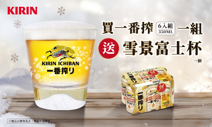 ▲活動內容:買一番搾啤酒350ml多入組,送【雪景富士杯】乙個。