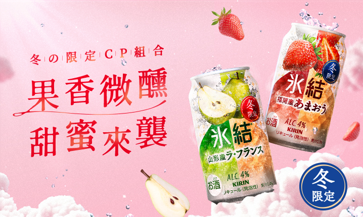 今年就帶上這最甜蜜微醺的CP組合「KIRIN冰結調酒-甘王草莓」、「KIRIN冰結調酒-西洋梨」一起度過冬天!