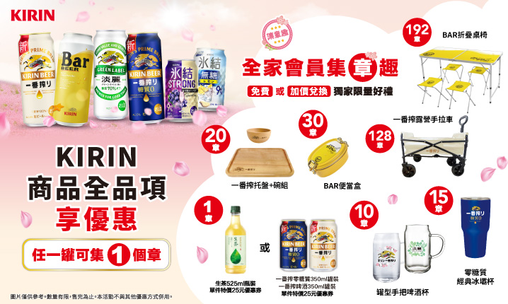 ▲活動內容:活動期間於全家便利商店購買KIRIN麒麟啤酒指定品項享優惠。購買單罐即可參加Family Mart APP「全家集章趣」活動集章,每罐可集一章,集滿指定章數可免費兌換或加價購兌換KIRIN獨家限量好禮!