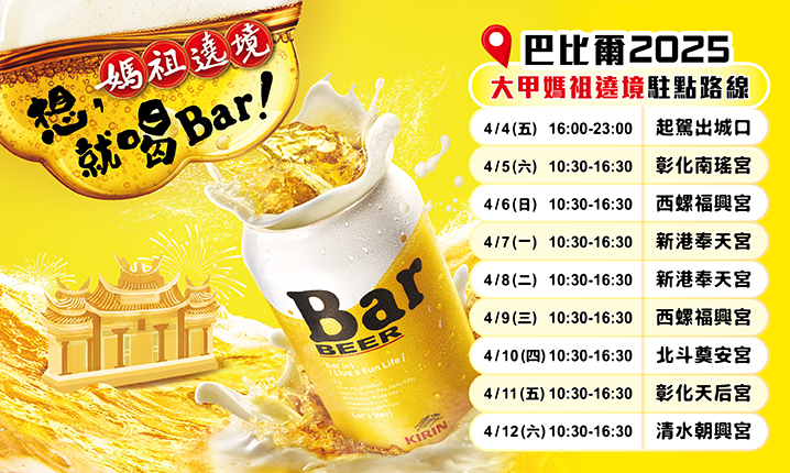KIRIN Bar BEER多年來秉持著活力、積極的精神,連續八年參與台灣年度盛事「大甲媽祖九天八夜遶境」活動。今年,KIRIN Bar BEER也將持續力挺大甲媽祖遶境,號召粉絲們一起到各大駐駕點和巴比爾一起應援媽祖遶境Bar!