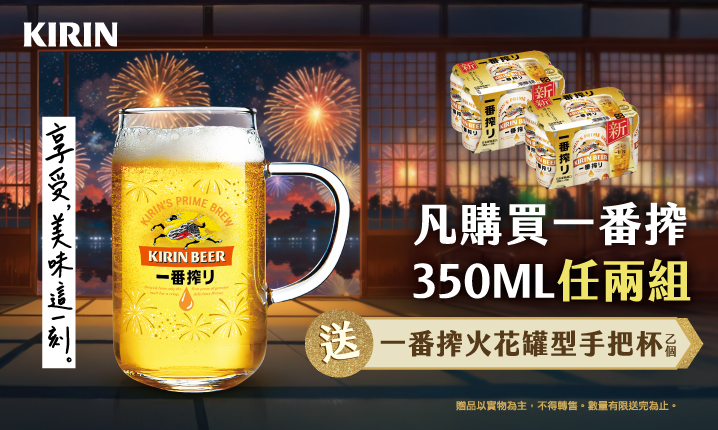 ▲活動內容:購買一番搾啤酒350ml多入組兩組,即可獲得【一番搾花火罐型手把杯】乙個。