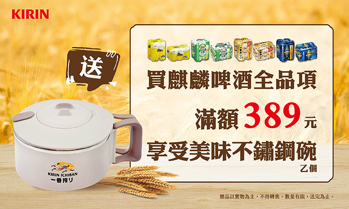 購買麒麟啤酒系列商品,滿額389元即有機會獲得【享受美味不鏽鋼碗】乙個。