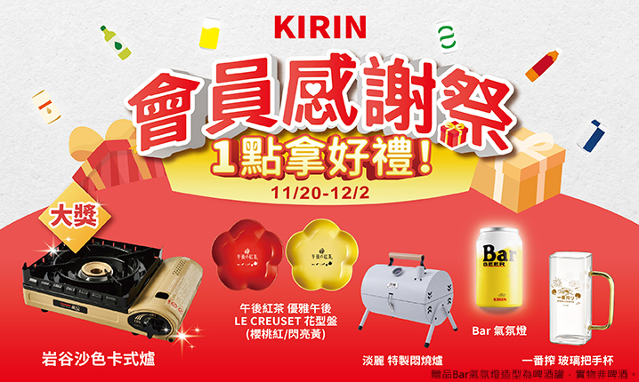 KIRIN感謝會員2025年的支持與肯定!即日起至12/2舉辦「KIRIN會員感謝祭」抽獎活動!KIRIN會員使用現有KIRIN POINT點數1點,就能參加好禮抽獎,大獎推出「岩谷沙色卡式爐」、午後紅茶優雅午後LE CREUSET花型盤、啤酒控最想蒐集的Bar氣氛燈、一番搾玻璃把手啤酒杯」等!快使用現有會員點數,立即參加!