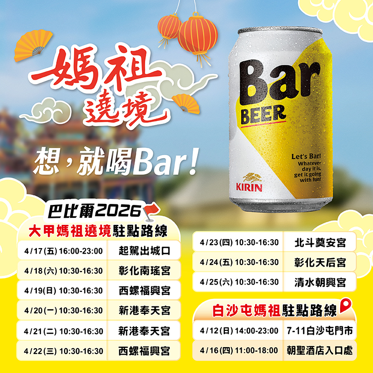 KIRIN Bar BEER多年來秉持著活力、積極的精神,每年持續參與台灣年度盛事「大甲媽祖九天八夜遶境」及「白沙屯媽祖進香」活動,號召粉絲們一起到各大駐駕點和巴比爾一起應援媽祖遶境Bar!